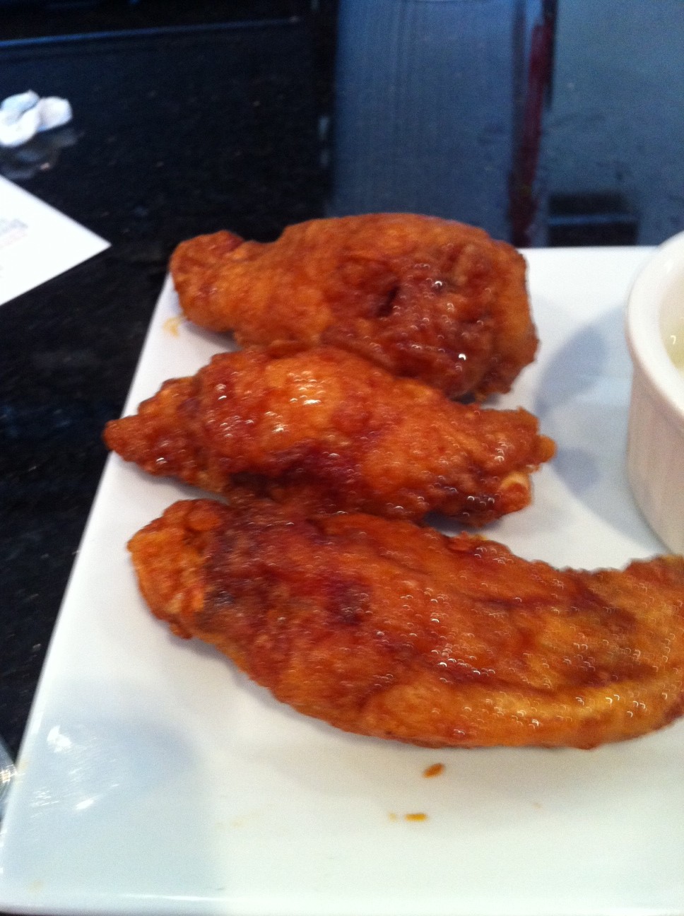 The chicken comes with two sauces — soy garlic or spicy soy garlic. I opted for the spicy, which had a wonderful kick, but was not overpowering. And unlike a lot of American wing places, the sauce is applied gently and is not messy.